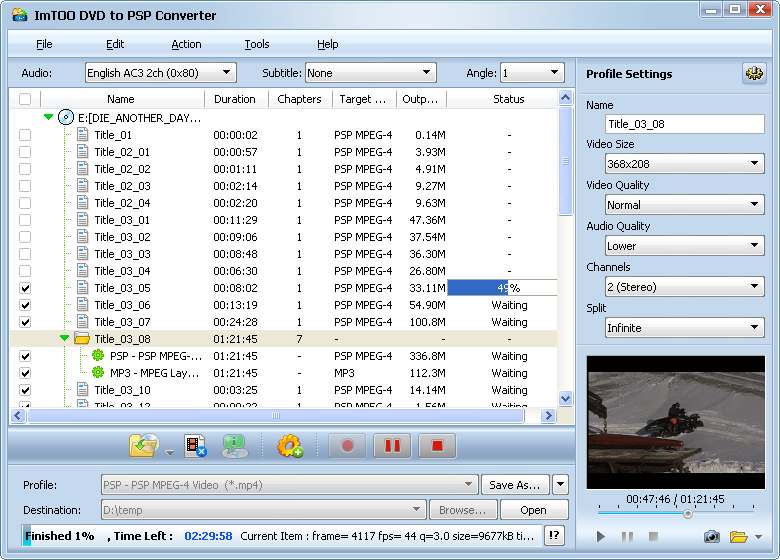 · Multi-threading and batch conversion are supported thus the more files you convert within one time the faster ImTOO DVD to PSP Converter works than other PSP converters
